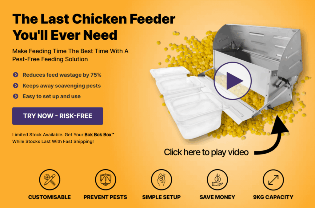 The landing page clearly communicates the Bok Bok Box™’s practical benefits, reducing feed wastage, keeping pests away, and being easy to set up, without feeling pushy. The messaging focuses on solving common pain points for chicken owners and builds trust by mentioning a risk-free trial and limited stock. The copy is concise and scannable, making the value obvious without aggressive selling.