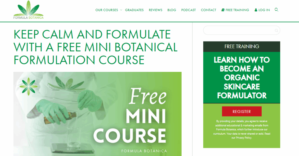 - Clear, educational value proposition (“Free Mini Botanical Formulation Course”)