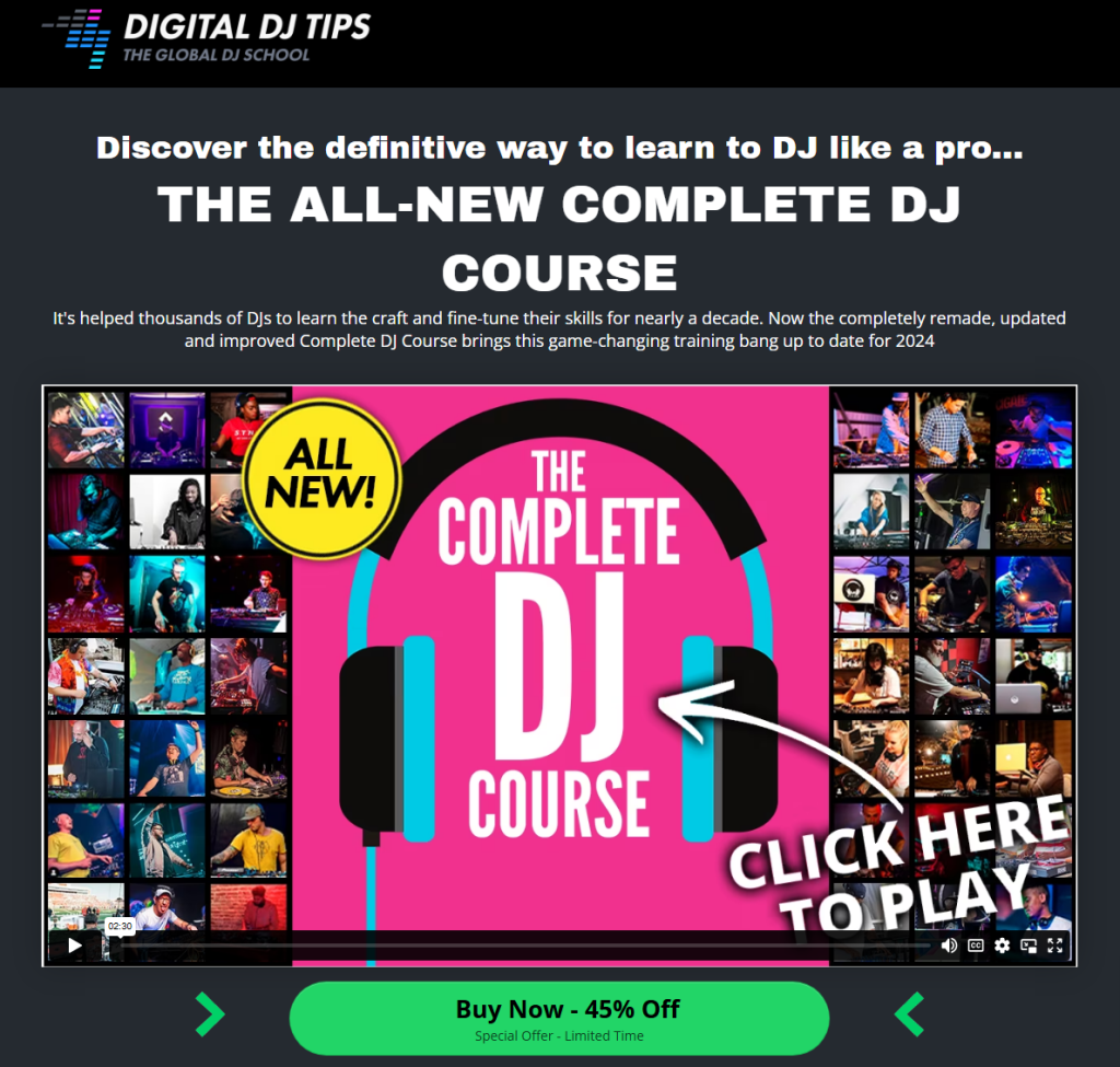 The landing page highlights the Complete DJ Course’s value and credibility, noting nearly a decade of helping thousands of DJs. The 2024 update feels fresh and game-changing. A prominent video, “All New!” labels, and a strong discount CTA (“Buy Now – 45% Off”) grab attention, while visuals of instructors and students add social proof.