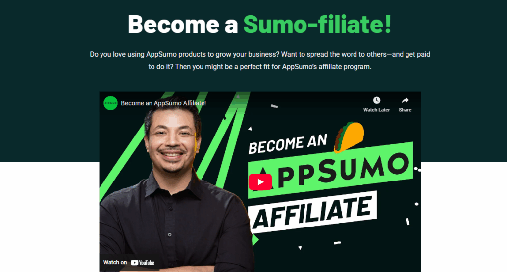 The AppSumo affiliate landing page grabs attention with a playful headline (“Become a Sumo-filiate!”) and clearly presents the opportunity to earn by sharing products. A short, focused copy and an engaging video help potential affiliates connect with the brand