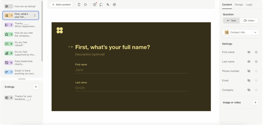 - Conditional Logic: Adapt which questions appear based on prior responses using a visual logic builder.