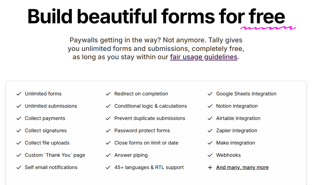 Tally provides a simple form builder with unlimited forms and submissions on its free plan. Its interface is straightforward, and it includes basic conditional logic, payment collection, and integrations. This makes it a practical option for teams that need core form functionality without advanced features.