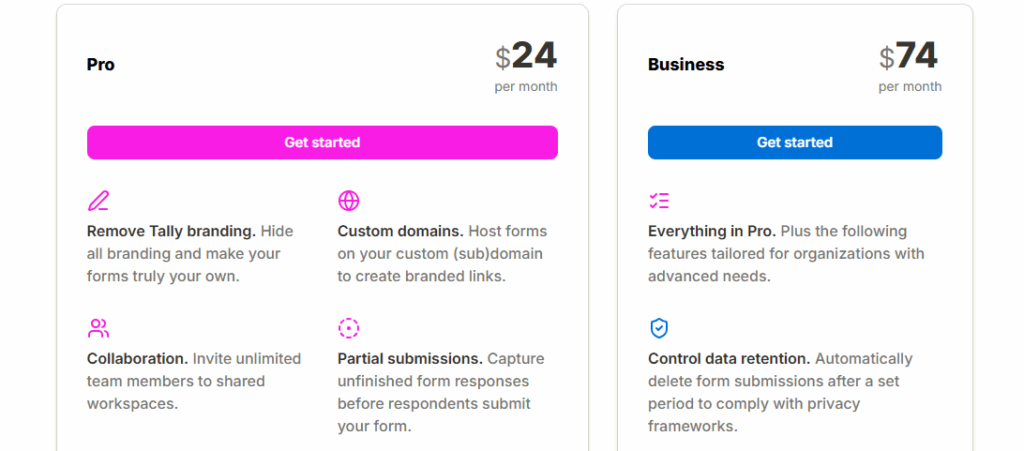 - Pro: $24/month with branding removal, custom domains, partial submissions, and team collaboration.