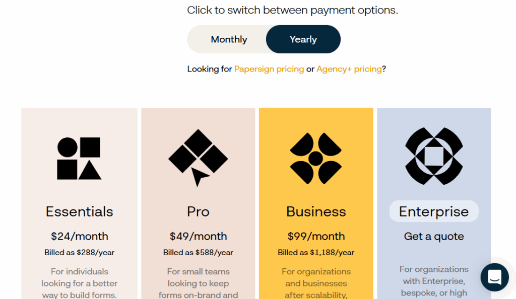 - Essentials: $24/month with unlimited forms and up to 1,000 submissions per month.