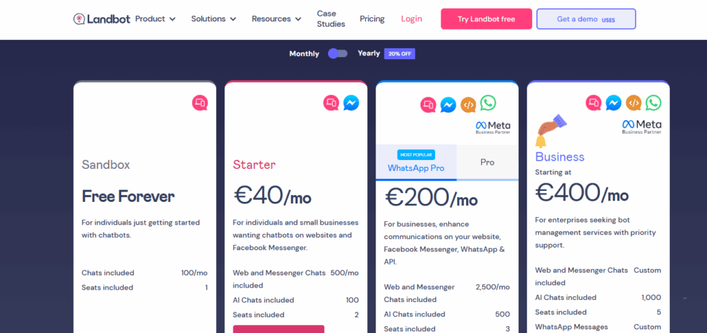 - Sandbox (Free Forever): 100 chats/month and basic integrations.