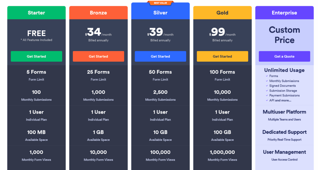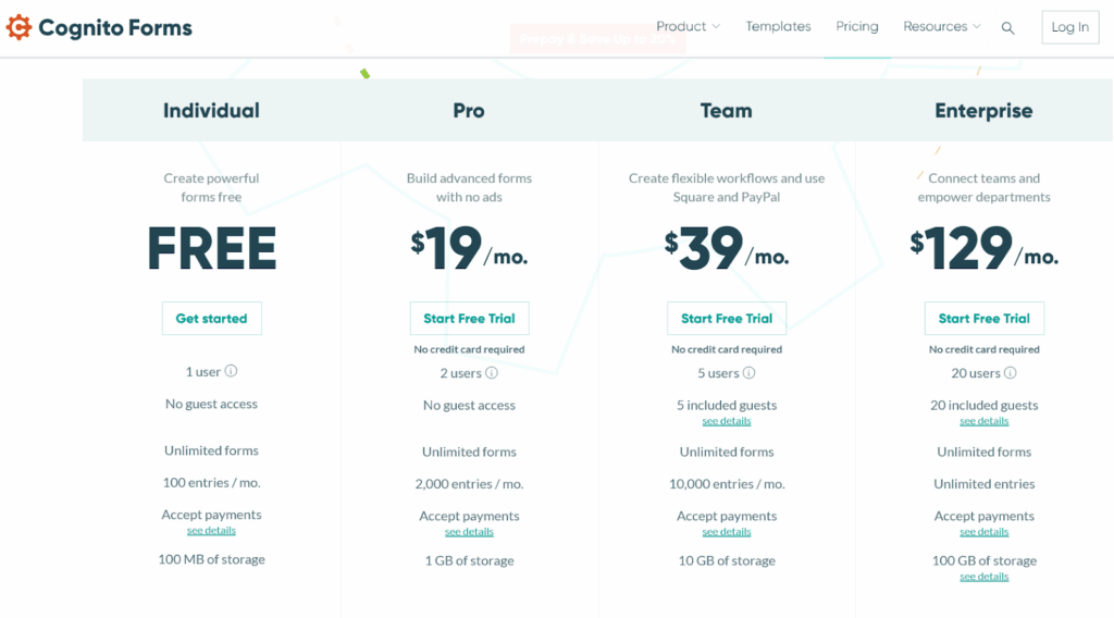 Cognito Forms ofrece un plan gratuito limitado con sólo 500 entradas al mes. Para más, los usuarios pueden suscribirse a cualquiera de los planes de pago a partir de 19 $/mes.