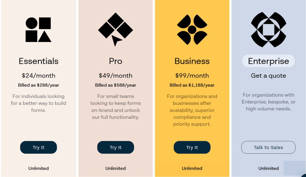 Typeform ofrece un plan gratuito con respuestas limitadas, y 3 categorías de planes de pago: Básico, Crecimiento y Talento. Los planes básicos (facturados anualmente) incluyen: