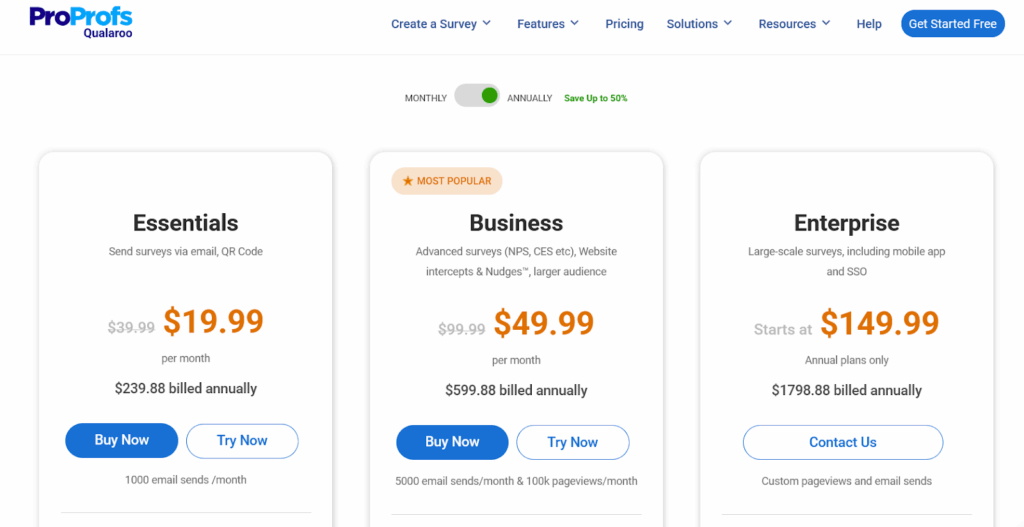 Qualaroo ofrece un plan Forever Free con funciones limitadas, además de planes de pago a partir de 19,99 $ al mes. El plan Enterprise incluye respuestas ilimitadas, dominios, usuarios, segmentación avanzada, SDK, API y análisis de opiniones.