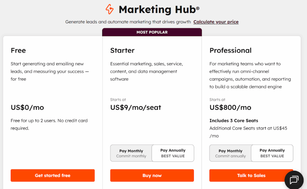 - Marketing Hub Enterprise: From $3,600/month (billed annually), full feature set for large organizations