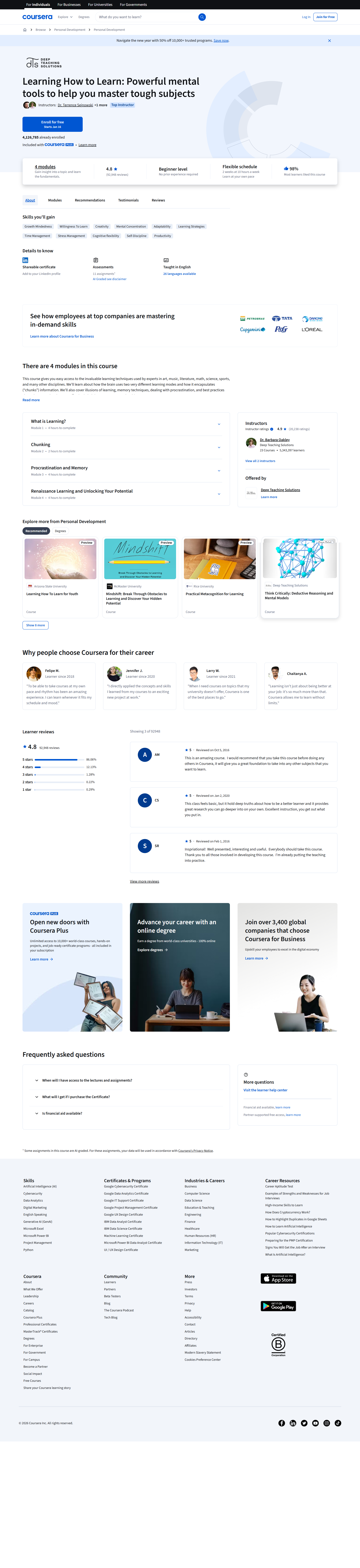 Coursera’s Learning How to Learn is an online course that teaches practical, science-backed techniques (like chunking, memory tools, and anti-procrastination strategies) to help you learn faster and master difficult subjects more effectively.